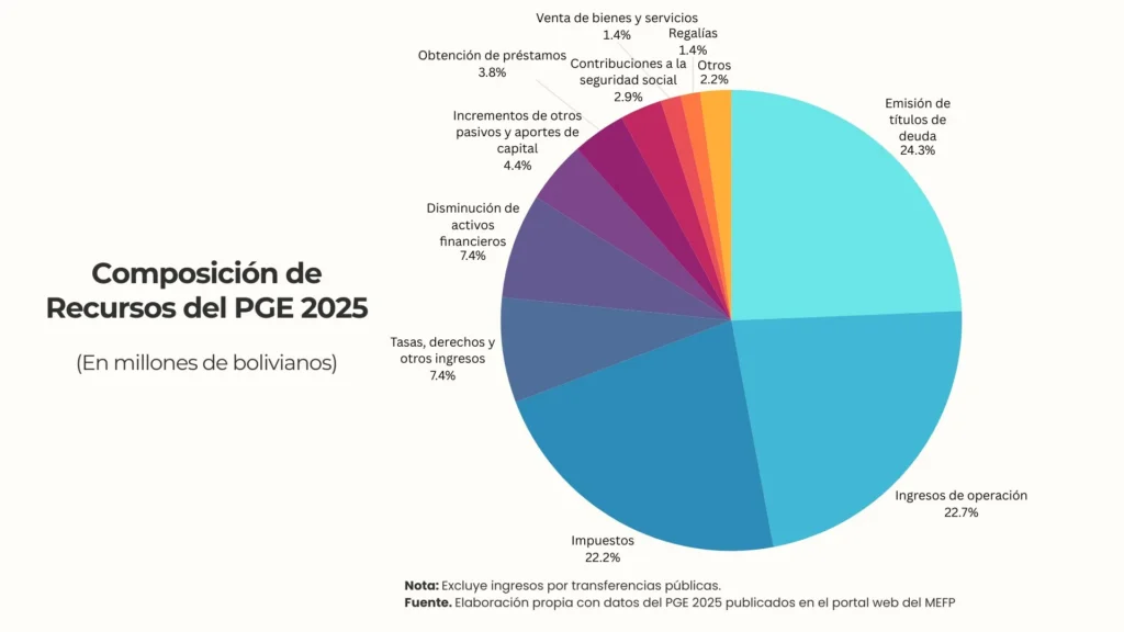 En este artículo analizaremos la composición del presupuesto de recursos del PGE 2025 de Bs369.340.694.521, descontando las trasferencias entre entidades públicas para evitar duplicar la fuente, por tanto, examinaremos Bs302.774.766.054 del presupuesto aprobado.