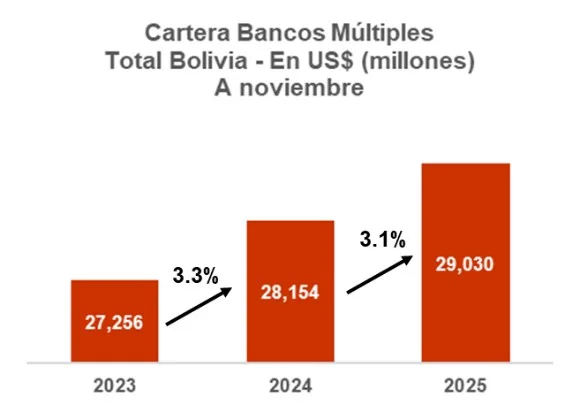 El crecimiento de Cartera Total de la gestión 2024, respecto de la gestión 2023 fue de USD 897 millones (3.3%) y la gestión 2025 creció USD 876 millones (3.1%). Los crecimientos de ambas gestiones, tanto en valores absolutos como en valores relativos, son similares. El crecimiento de 3.1% (2025) sigue siendo mayor al crecimiento proyectado del Producto Interno Bruto, que se estima cercano a 1%.